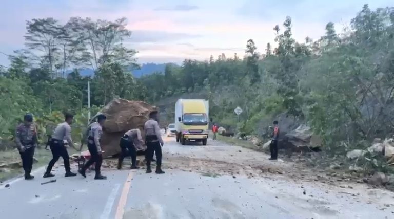 Longsor Tutup Sementara Jalur Trans Kalimantan di Sungai Urang, Warga dan Personel Brimob Gotong Royong Buka Akses