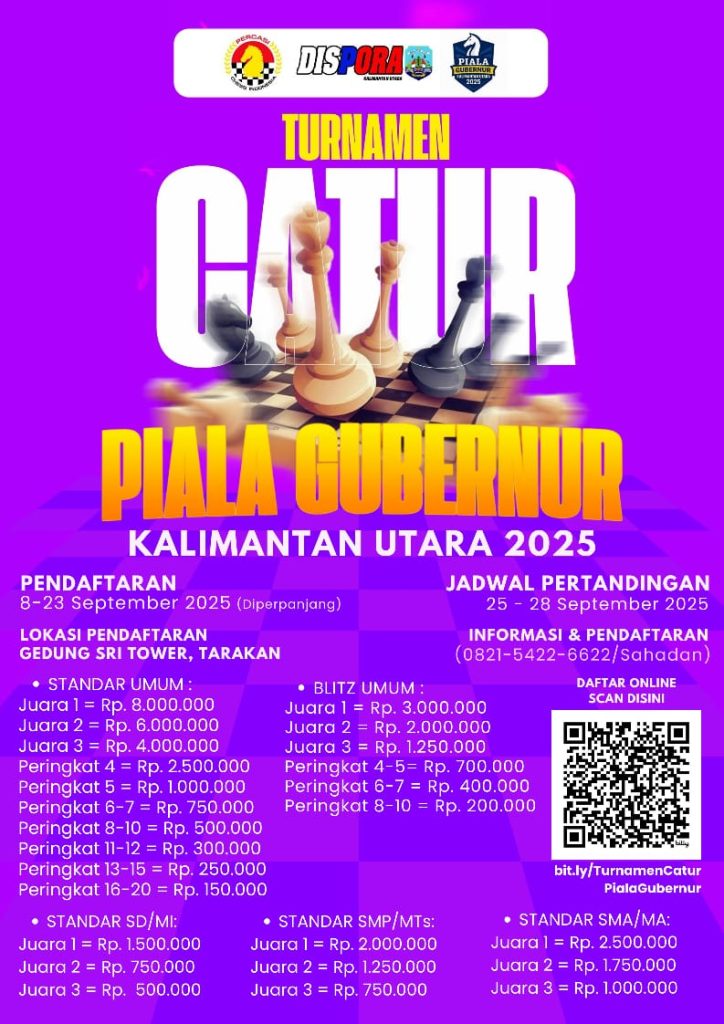 “Turnamen catur ini diadakan untuk menjadi wadah para pecinta catur dan komunitas catur menyalurkan hobi, kreativitas, dan ketangkasan. Tetapi tujuan utamanya adalah mencari bibit unggul pecatur di Kaltara,” ujarnya, Kamis (25/9/2025).